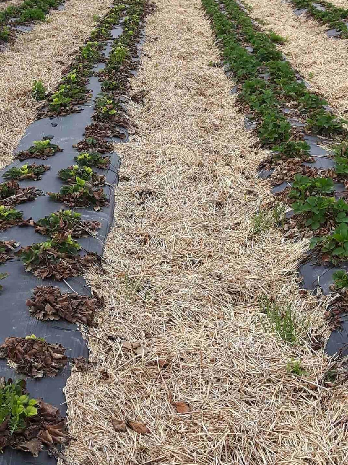 Description: Des plants de fraisier d'une nouvelle plantation montrent un jaunissement des nouvelles feuilles ainsi que des brûlures sur les plus vieilles allant même jusqu'à la nécrose des plants. Ces symptômes sont attribuables à l’application de paille traitée au glyphosate, sur les rangs de la plantation à l’automne précédent. Les symptômes sont très localisés sur certains rangs. Le dosage chimique réalisé a montré une concentration importante de glyphosate dans les tissus des plants échantillonnés.