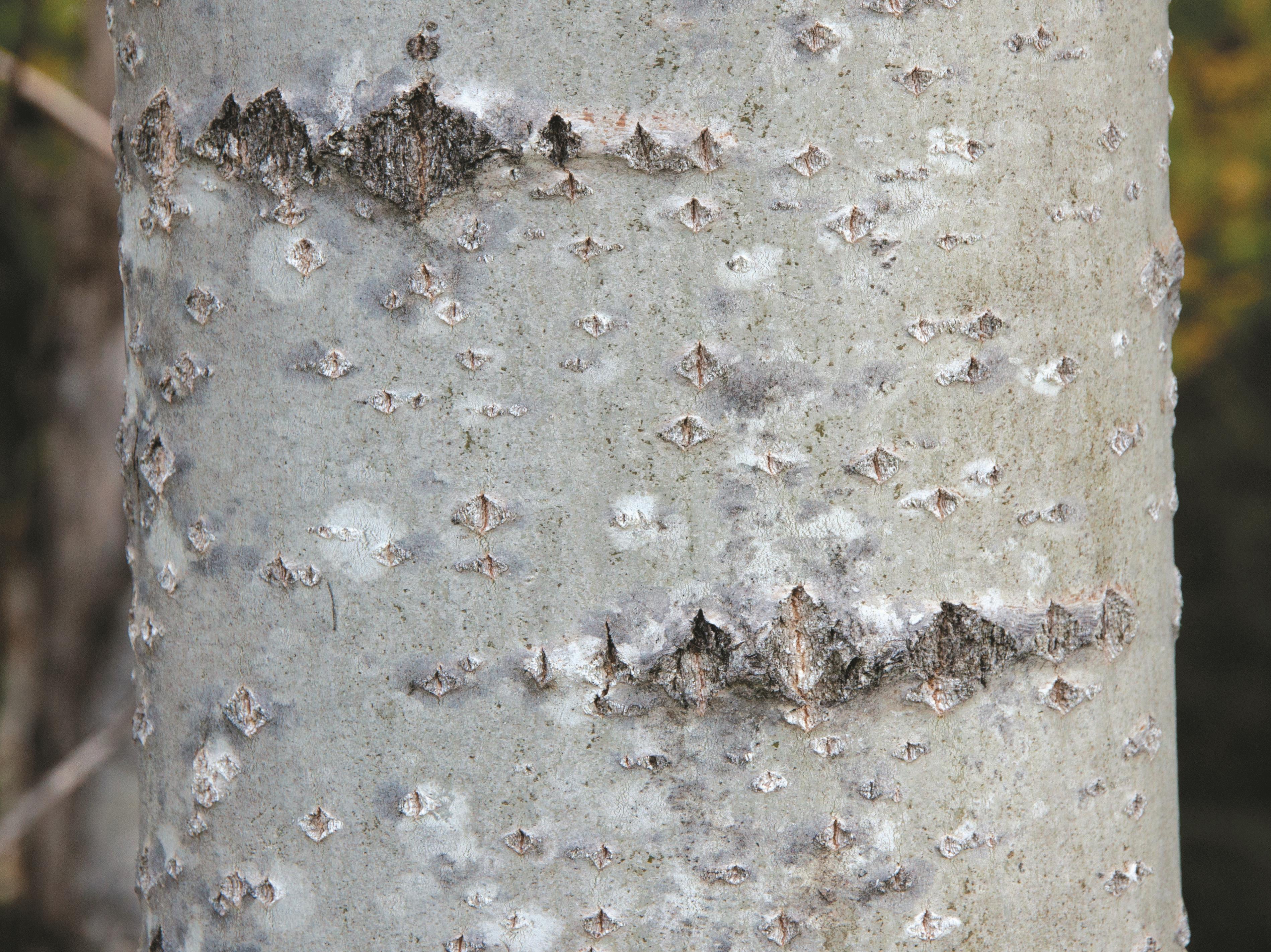 Légende: Tronc d'un jeune arbre, écorce grisâtre