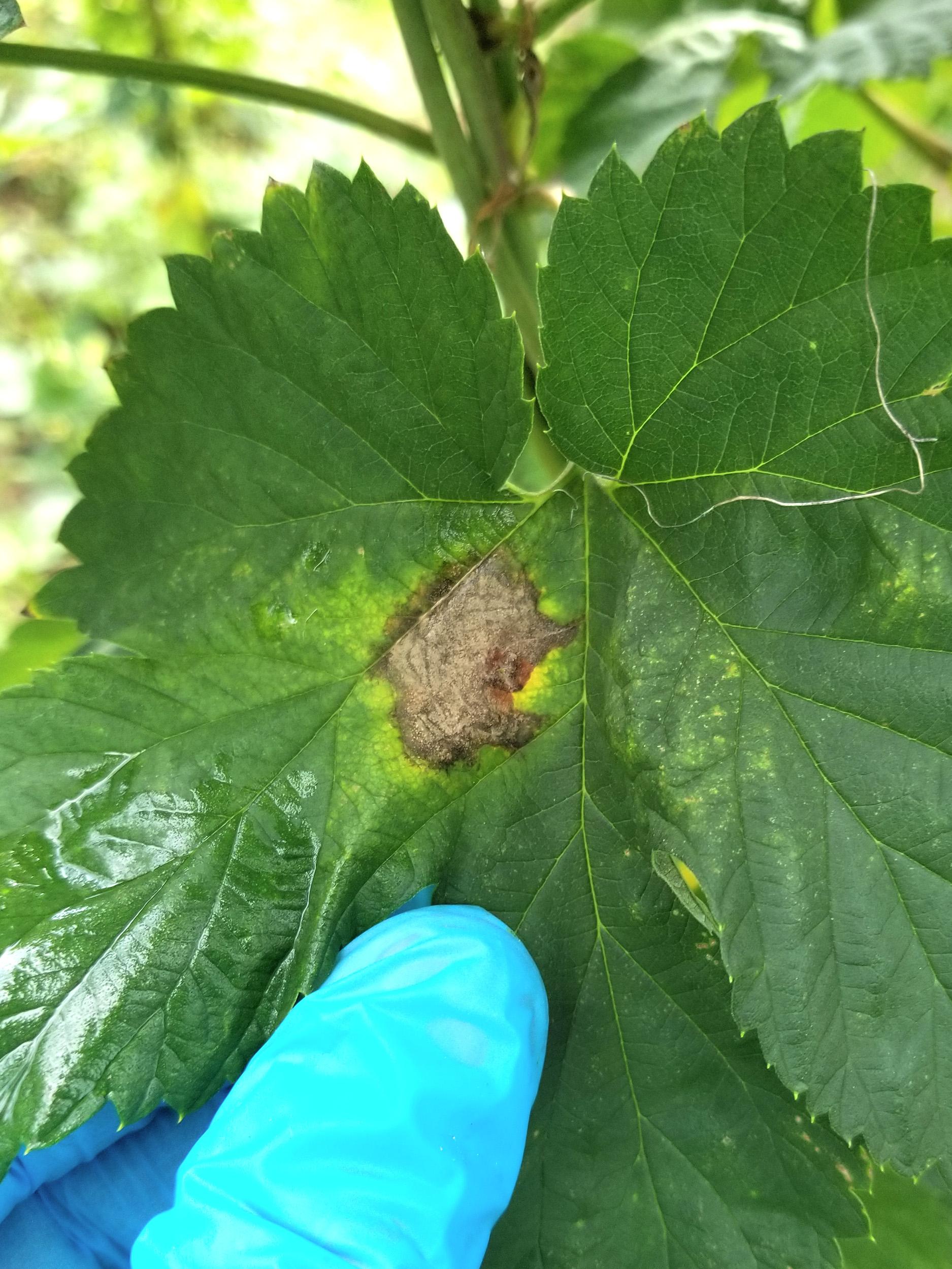 Description: Sur la face adaxiale des feuilles, des lésions plutôt larges apparaissent en cours de saison. Un halo jaune entoure typiquement la lésion brun-gris. Des pycnides noires peuvent parfois être aperçues sur ces taches.