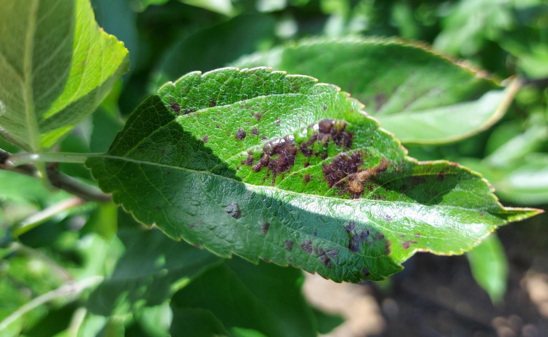 Description: Une feuille de pommier du cv Royal Gala montre des taches rougeâtres devenant brun foncé, réparties aléatoirement sur le limbe, de forme et de grosseur variables et présentes uniquement à la face adaxiale. Ces symptômes ne sont pas de nature phytopathologique mais plutôt liés à un facteur non parasitaire, soit une réaction phytotoxique aux produits de protection appliqués, en particulier le cuivre (sulfate de cuivre tribasique). Bien que ce produit soit homologué chez le pommier, celui-ci peut endommager les feuilles (et fleurs/fruits), selon les conditions environnementales au moment de son application. Les conditions froides et humides accentuent les symptômes de phytotoxicité chez les cultivars sensibles.