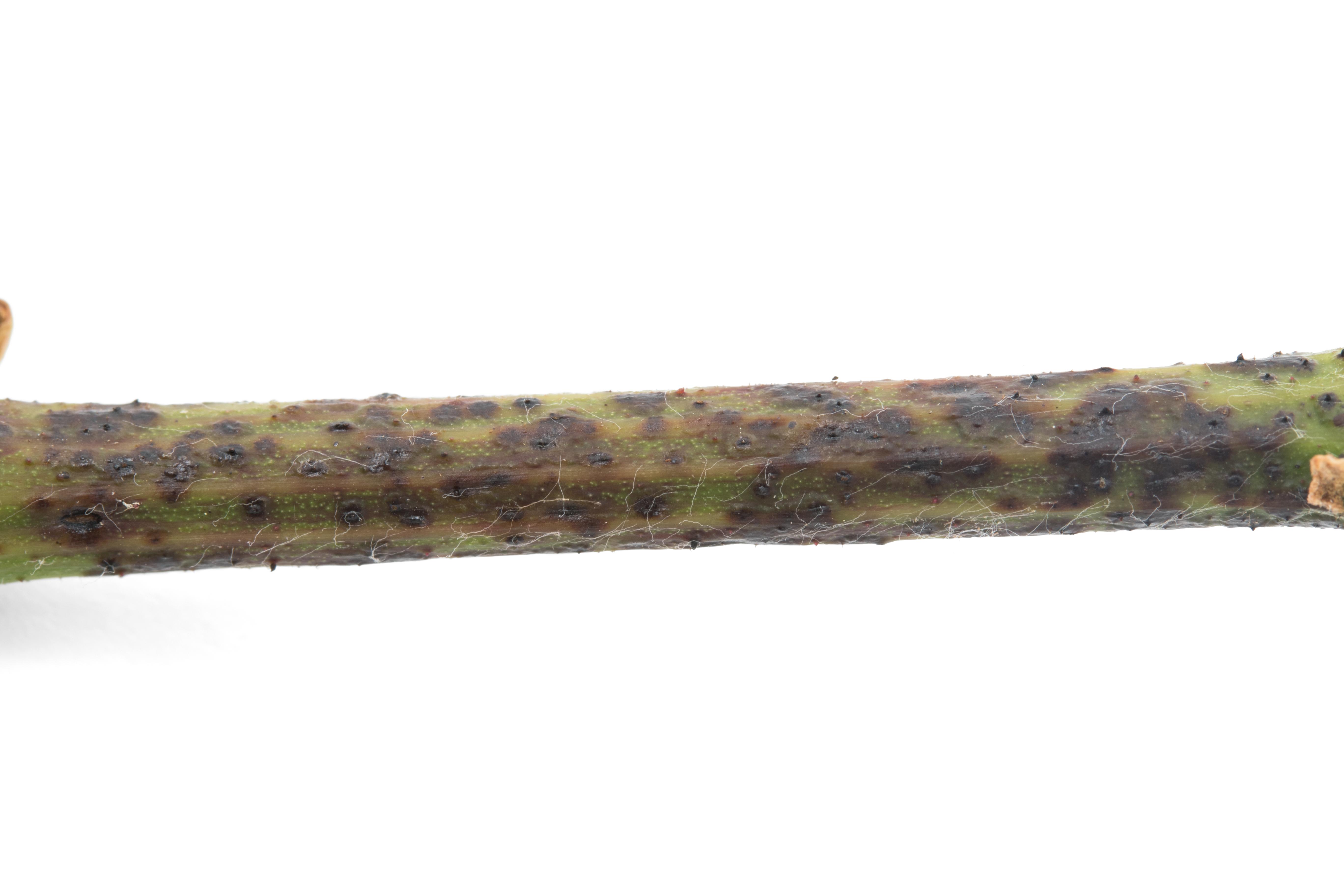 Description: Symptôme de l'excoriose sur un pétiole de vigne. On remarque la présence de pycnides, petits renflements noirs, en formation au centre des lésions.
